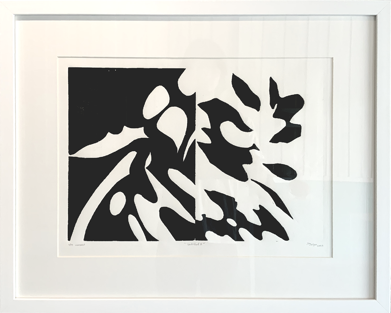 (L) Untitled 5, 2023, Woodcut print, 45.8 x 35.5 cm.