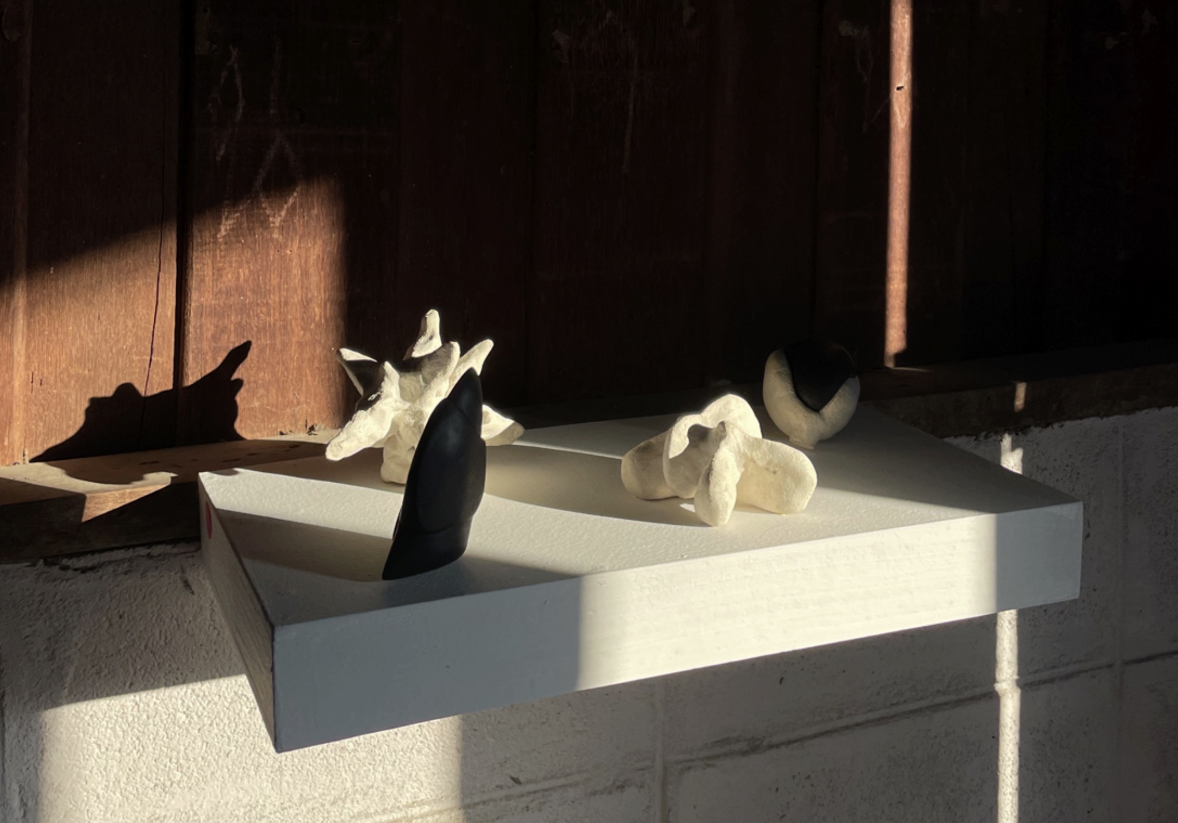Wisarut Thatthong was selected to join the AIR for Emerging Artist Program 2023 (December2022 – March 2023) at Nong Pho community for 3 months, operated by Baan Noorg Collaborative Arts and Culture. The artist has familiarized with his new setting, observed the passing of time and discovered the images visualized by lights and shadows that occurred in certain periods of time and began developing his work from woodcarving, with the effort to transform the untouchable lights and shadow values into 3-dimensional sculptures. Sculpting has been Wisarut’s specialty, however, woodcarving was his new challenge, the process led him to being interested in the material. He has been exploring negative and positive spaces that he experienced and expressed them through the process of woodcut printmaking, which is his very first opportunity to have encountered the technique recently. The transformation from 3-dimensional sculpture into 2-dimensional paper indicates the distinct contrast of lights-shadows and positive-negative. While working on the prints he also created small sculptures with stucco, inputting a neutral value towards the whiteness of the material. It has balanced the whole picture of the wooden sculptures and the woodcut prints ,discovering a bridge that forms a circulation flowing back and forth from one medium to the another significantly, that allows new interpretation to emerge. The works generates forms, shapeshifting into the dimension that lights and shadows noticeably converge and diverge.